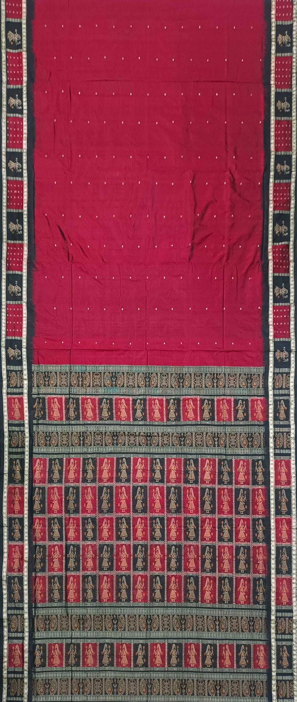 • Colours & Designs: Body in maroon color with Traditional mini buti designs, Border in maroon and black colours with traditional bomkai doll desigsn, Pallu in maroon and black colors with traditional doll Designs, Blouse piece in black color.