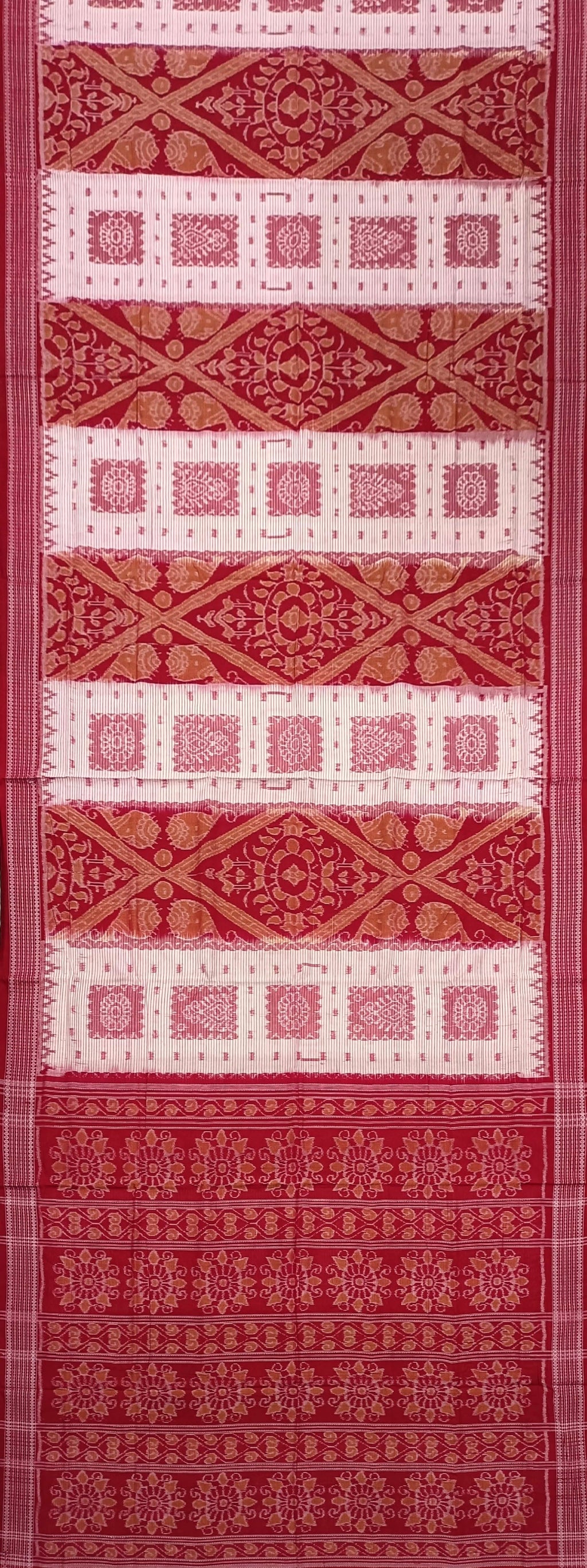 • Colours & Designs: Body in White and red colors combination with traditional sambalpuri designs, Border in red colour with lining buti designs. Pallu in red color with traditional flower Designs, Blouse piece in red colour.