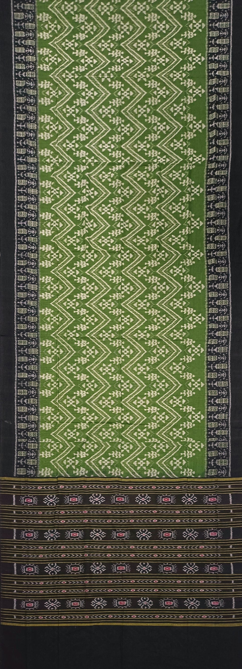 • Colors & Designs: Body in mehendi green color with traditional sambalpuri Designs, Border plain in black Color, Pallu in black and maroon color with Traditional flower Designs. Blouse piece in black color.