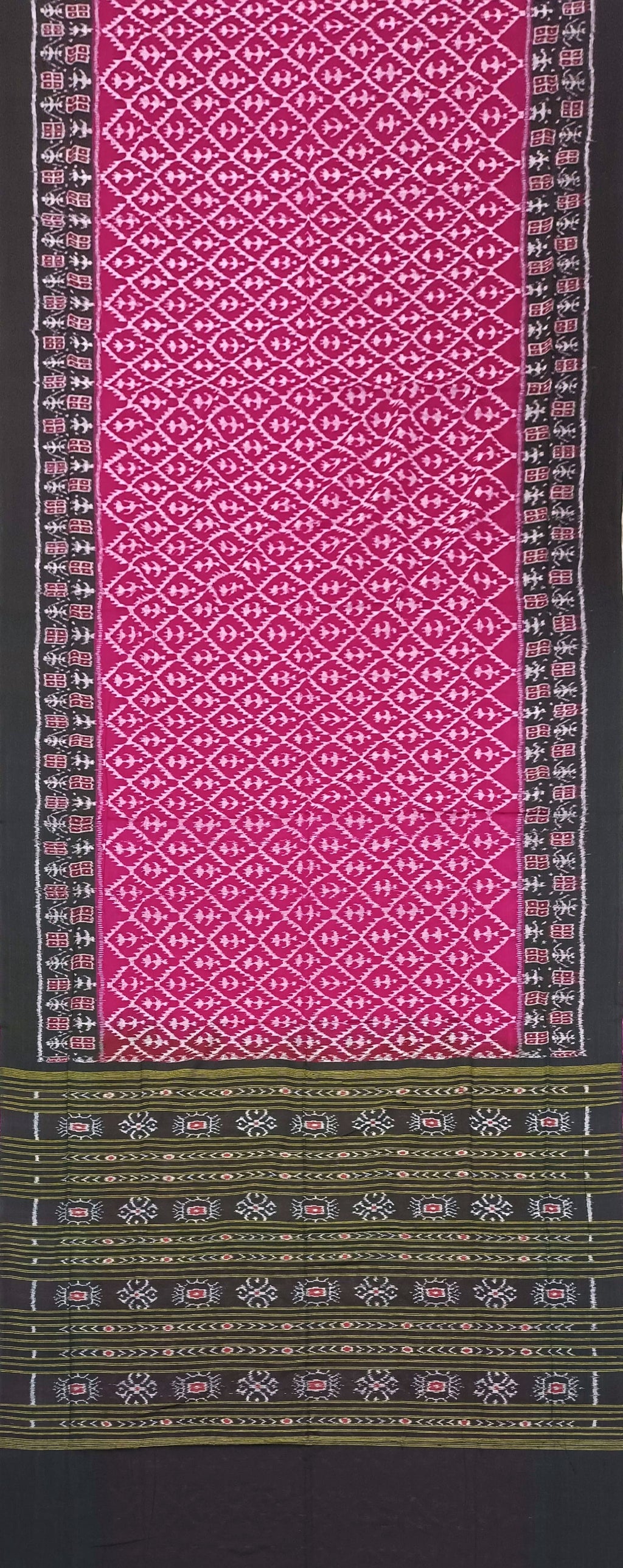 • Colors & Designs: Body in pink color with traditional sambalpuri Designs, Border plain in black Color, Pallu in black and maroon color with Traditional flower Designs. Blouse piece in black color.