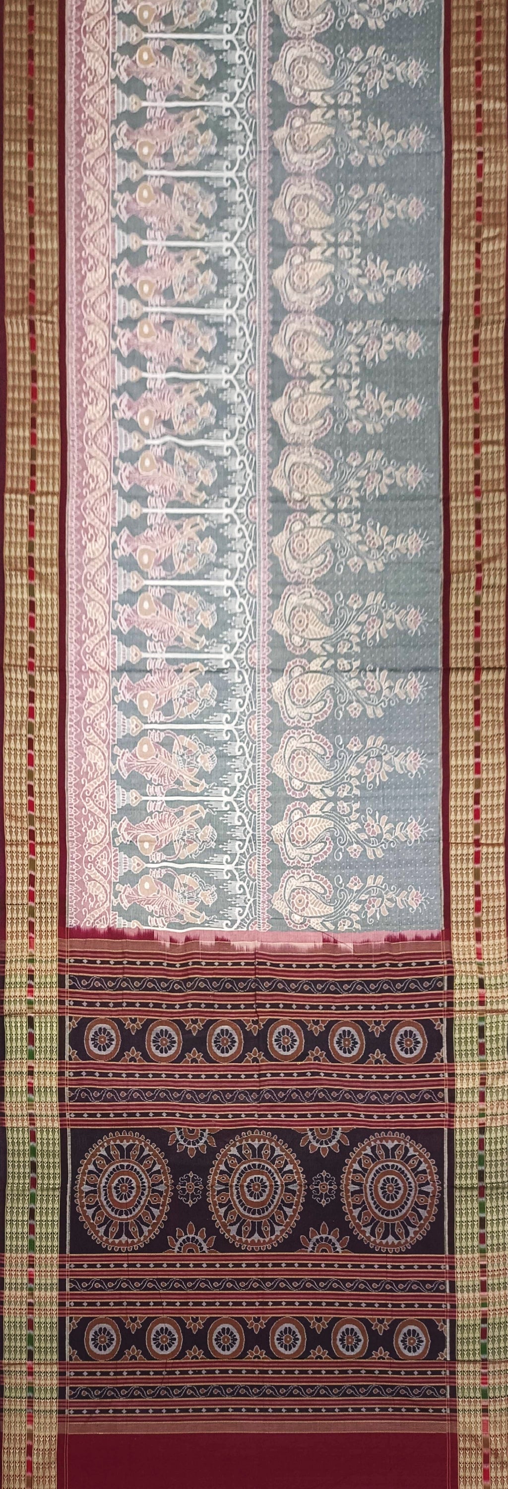 • Colours & Designs: Body in grey color base with beautiful Nartaki and flower designs, Wide Border in maroon color with lining fish buti designs. Pallu in maroon color with traditional flower Designs, Blouse piece in maroon color.