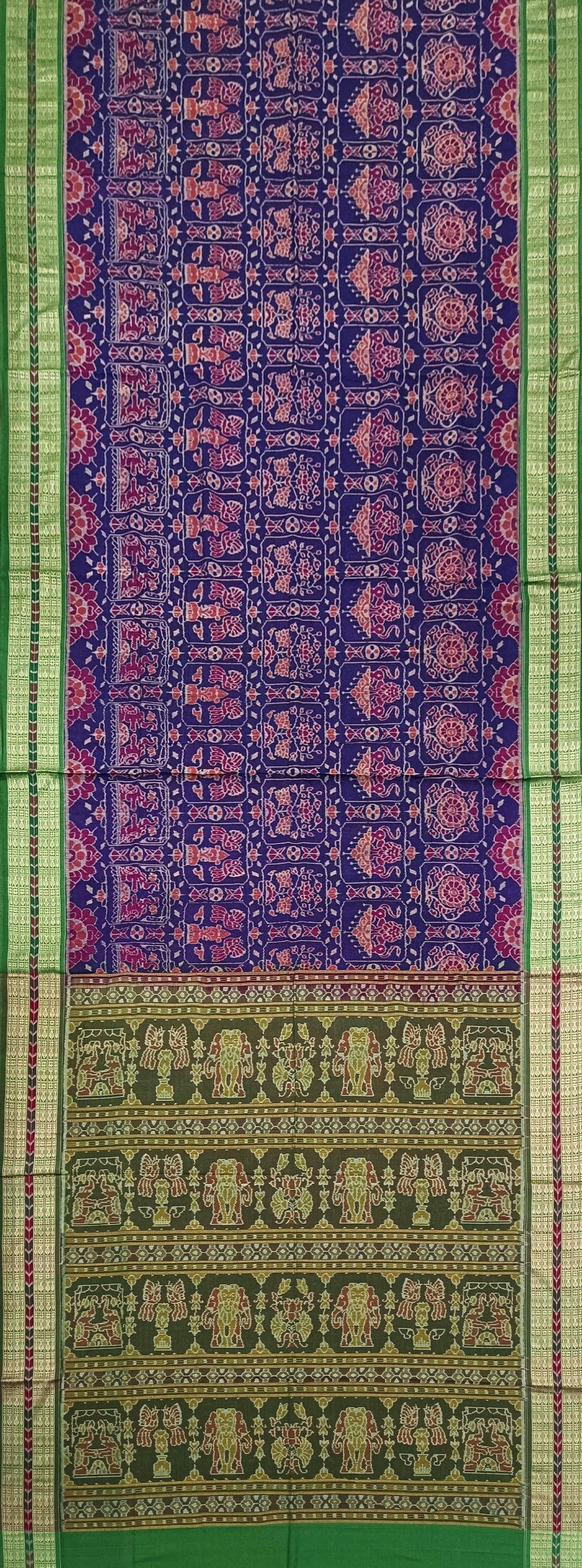 • Colours & Designs: Body in blue color base with animals, Birds and flower designs. Border in Green color with lining fish buti designs. Pallu in Mehendi green color with Flowers, animals and bird design, Blouse piece in green color.