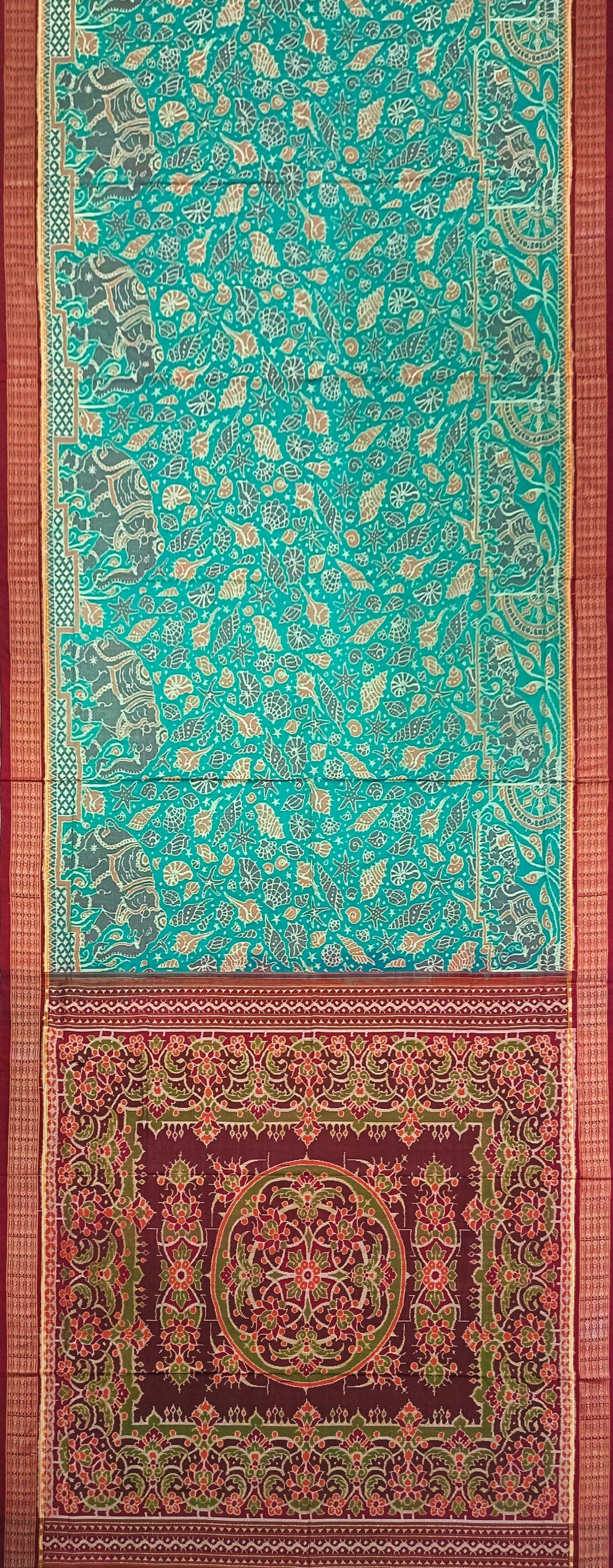 • Colours & Designs: Body in ramagreen color base with beautiful sea creature and elephant designs, Border in maroon color with lining fish buti designs. Pallu in maroon color with traditional big flower Designs, Blouse piece in maroon color.
