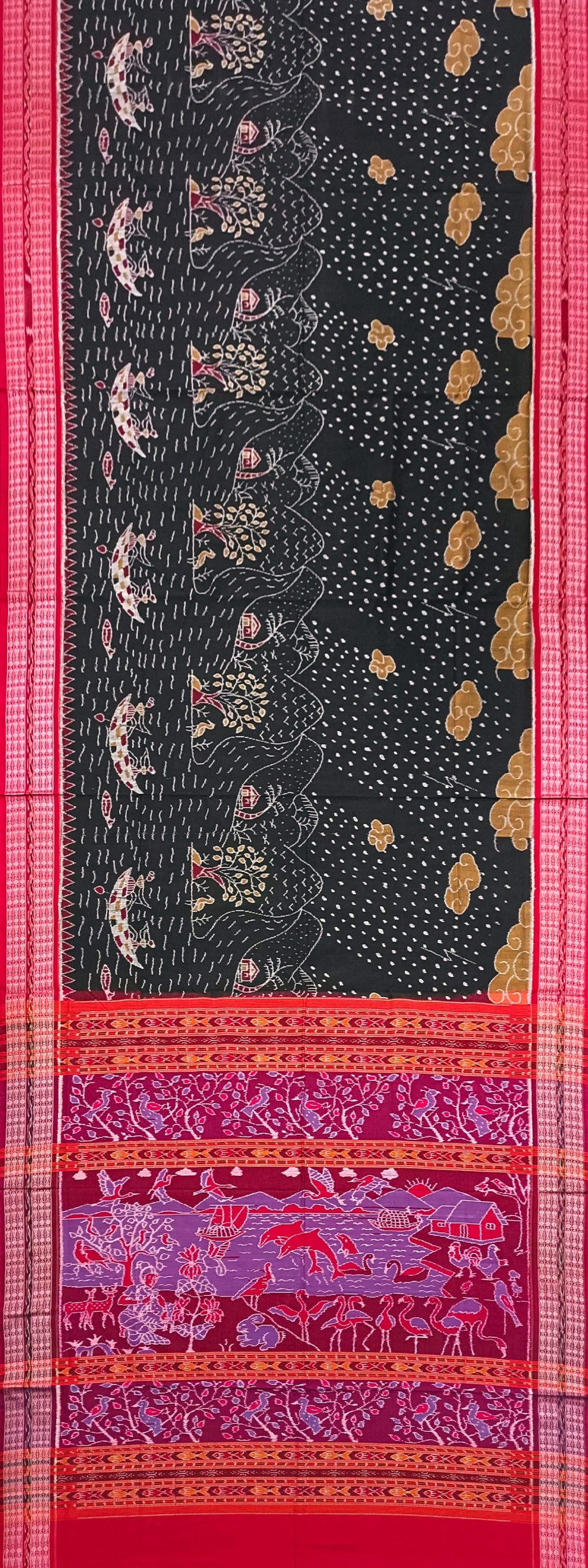 • Colours & Designs: Body in black color base with beautiful rainy day in hill and river side designs, Wide Border in red color with lining fish buti designs. Pallu in maroon color with viller village Designs, Blouse piece in red color.