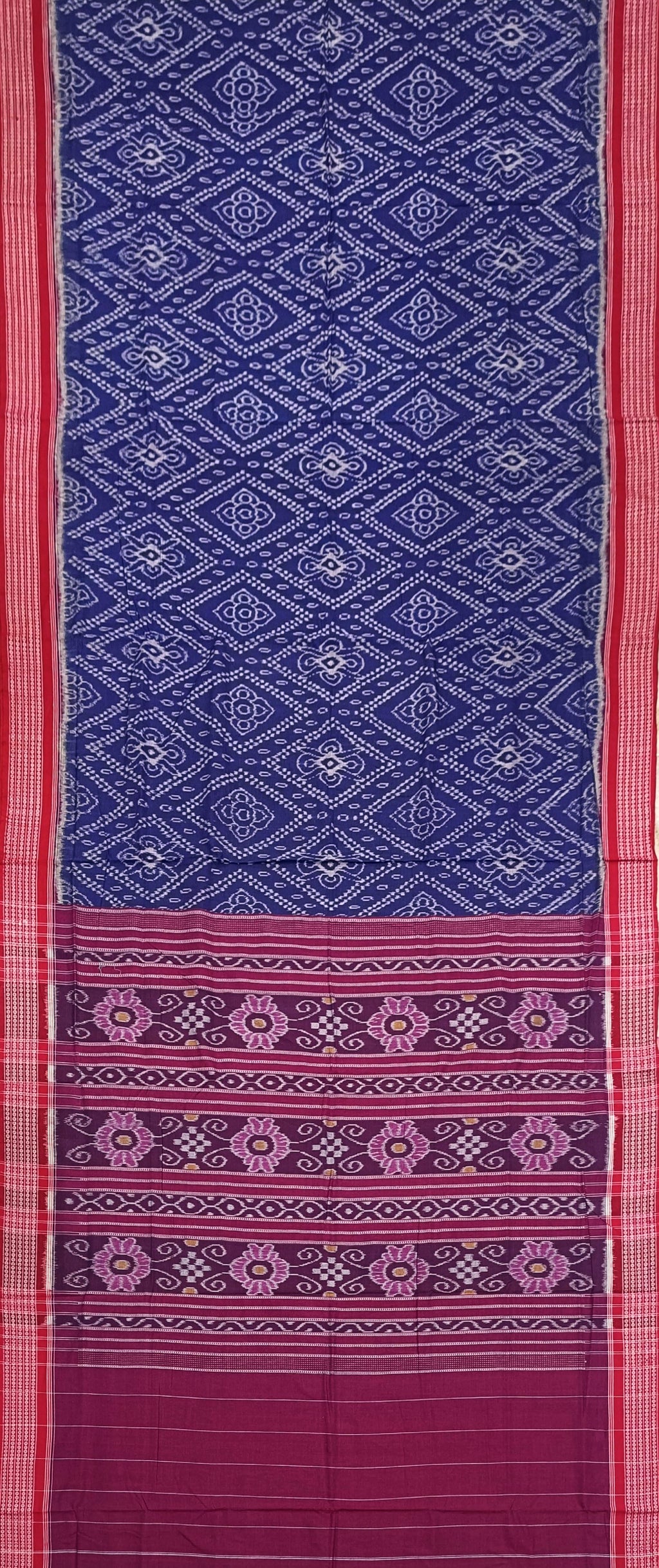 • Pallu in maroon and blue and maroonish purple colors with traditional sambalpuri Designs,